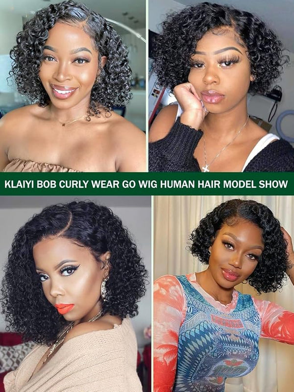 KLAIYI Short Curly Bob Wig Human Hair Bye Bye Knots Glueless Wig