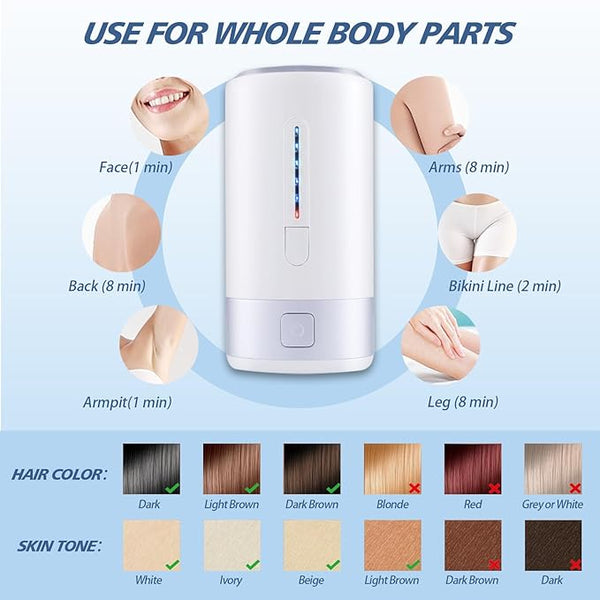 Suitable for both women and men, our hair removal device targets hair follicles and disrupts the hair regeneration cycle, ensuring gentle and effective hair removal. Applicable to different parts of the body, including legs, bikini line, arms, back, underarms, face, etc.