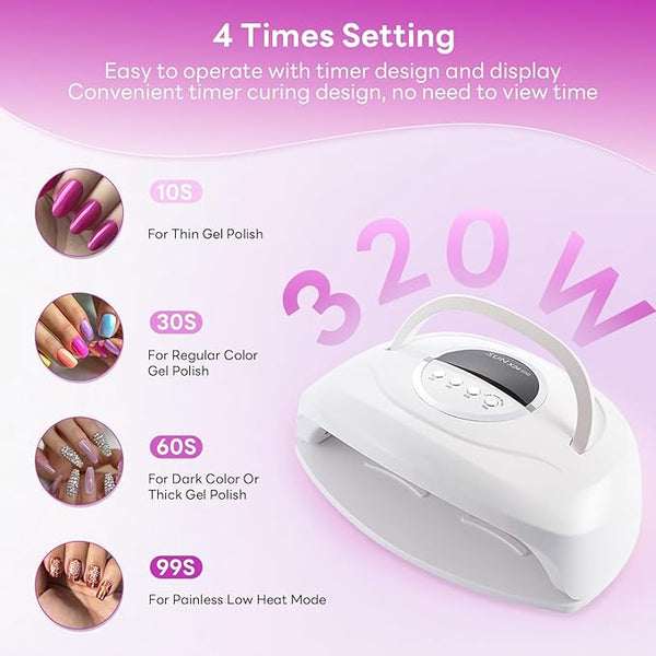 320W powerful machine makes nail dry works with Base Coat, Top coat, any brand color gel, hard gels, builder, acrylic, sculpture gel, CND Shellac ect.