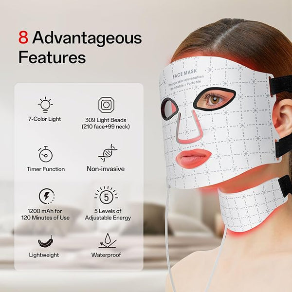 Facego Red Light Mask for Face & Neck features 7 light modes that tackle various skin concerns, like anti-aging, fading fine lines, and wrinkles. Equipped with 309 professional light beads ? 210 for the face and 99 for the neck ? it delivers synchronized dual-zone care, leaving no area neglected. Crafted from lightweight silicone, it fits comfortably. The 1200mAh battery offers 120 minutes of runtime, and its wireless design lets you multitask ? skincare while doing chores or watching TV.