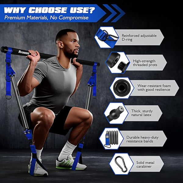 Adjustable Pilates Kit - designed to mimic cable machine equipment squat machine dumbbells and barbells, this home gym kit challenges muscle load during squats and dynamic exercises. Compared to traditional workout equipment, Pilates bar training is safer and there is no need to worry muscle strains