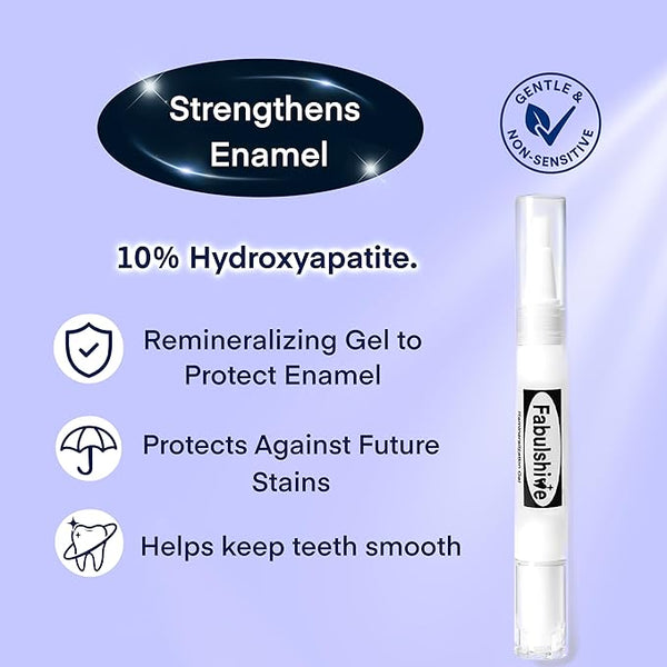 Fabulshine Teeth Whitening Gel Kit includes pre-filled whitening gel syringes, each containing 10 ml of gel, providing up to 25 whitening treatments. The kit also comes with a 2 ml remineralizing pen formulated with enamel-friendly ingredients to help protect your enamel and gums.