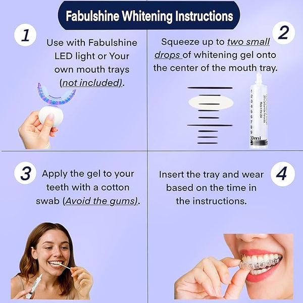Product descriptionFabulshins Pre-filled Teeth Whitening Gel Syringes & PenFabulshine Teeth Whitening Gel Kit includes pre-filled whitening gel syringes, each containing 10 ml of gel, providing up to 25 whitening treatments....