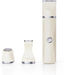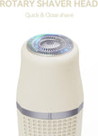 This multifunctional grooming kit has three replaceable cutter heads: standard head for legs and armpits, narrow head for bikini area or detail trimming, round rotary head for facial hair removal.