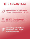 Ingredients like Garcinia Cambogia, Green Tea Extract, and the GLP-1 probiotic blend are included to support natural fullness signals and appetite control as part of a mindful eating routine.