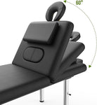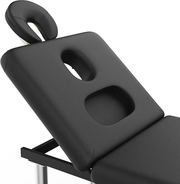 This stationary massage table features an adjustable backrest and C-shaped face pillow with a breathing hole for optimal client positioning. Adjustable stainless steel legs support up to 660 lbs, while the open-chest design enhances circulation. face cradle ensure superior support for facial massage