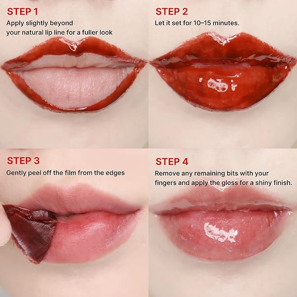 Step 1: Apply slightly beyond your natural lip line for a fuller look. Step 2: Let it set for 10?15 minutes. Step 3: Gently peel off the film from the edges. Step 4: Remove any remaining bits with your fingers, then apply gloss for a shiny, radiant finish.