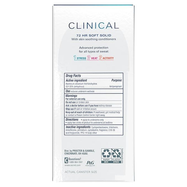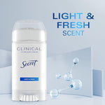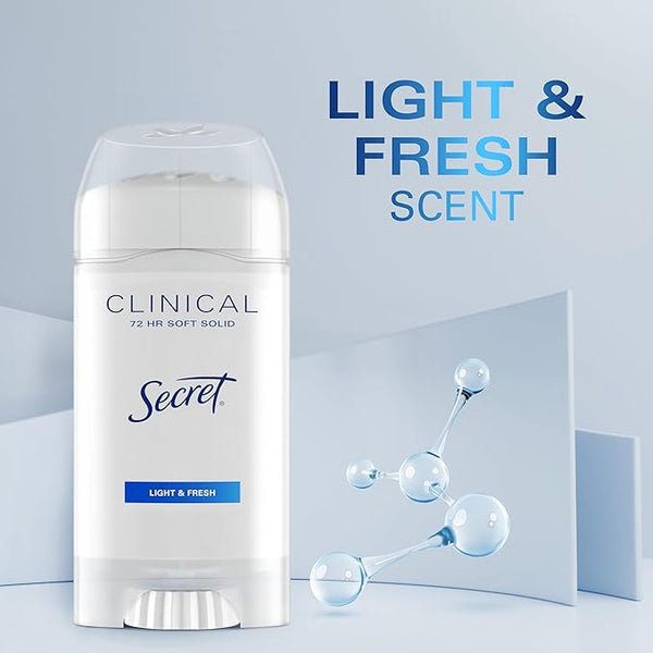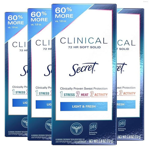 Secret Clinical Strength Antiperspirant Deodorant for Women, 3X Stress Protection, 72hr Sweat & Odor Protection, PH Balancing Minerals, Soft Solid, Light & Fresh Scent, 2.6 oz (Pack of 2)