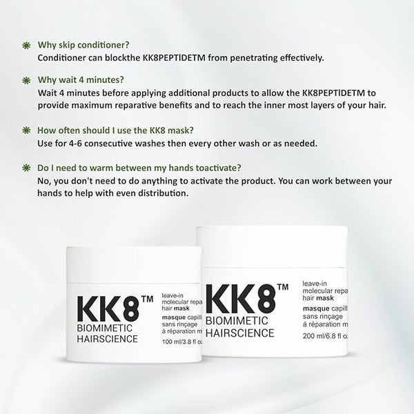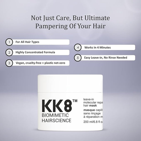 KK8 Biomimetic Hairscience delivers next-generation molecular hair repair. Powered by advanced biomimetic peptides and bond-restoring molecules, this leave-in mask rebuilds hair structure from within ? repairing damage, restoring strength, and leaving hair silky, resilient, and frizz-free