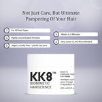 Formulated with biomimetic peptides, amino acids, and lipid-rich actives, KK8 penetrates deep into the cuticle to repair molecular bonds. This science-backed technology transforms dry, brittle strands into soft, manageable, and glossy hair